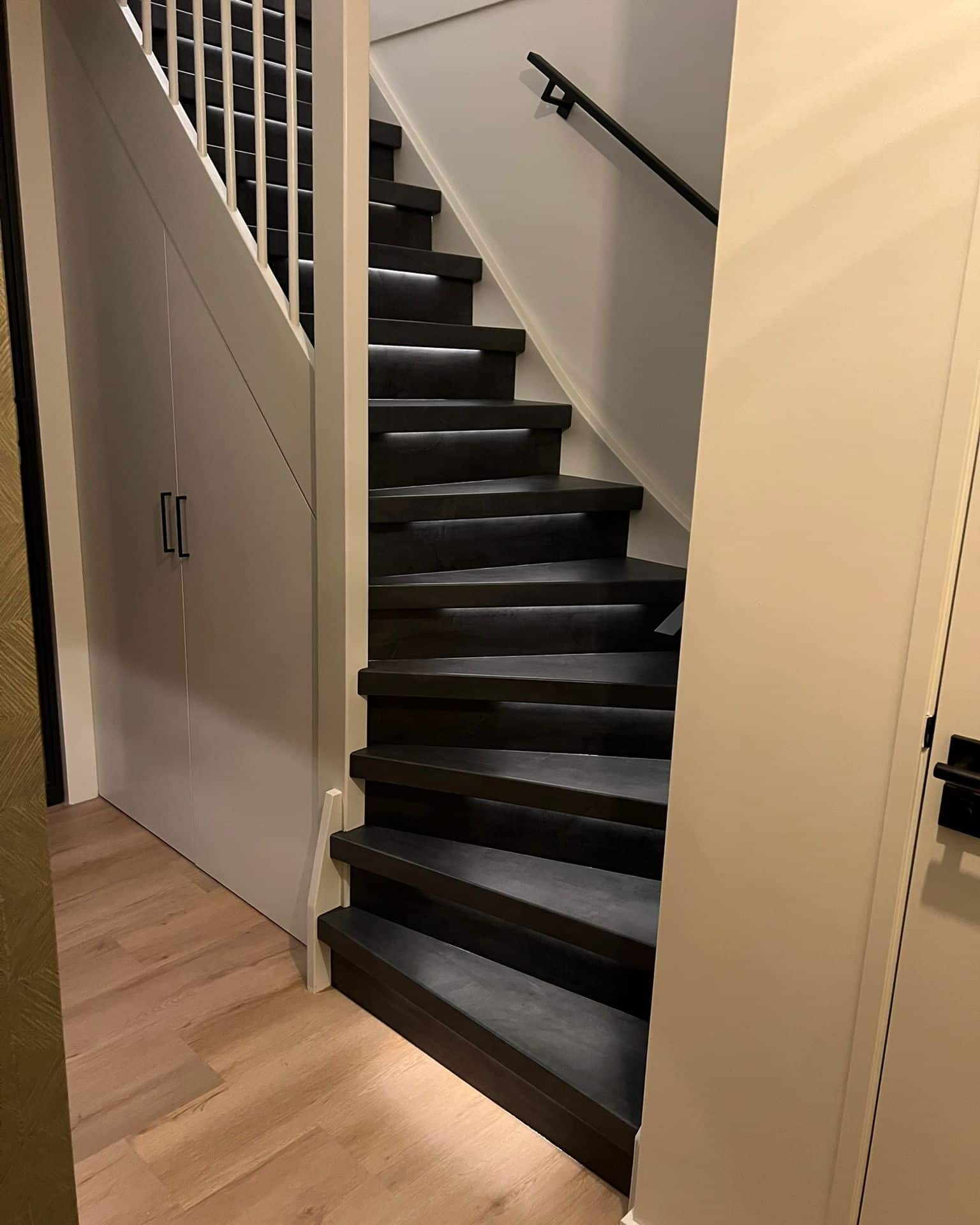 Zwarte laminaat traprenovatie met dimbare verlichting: modern, stijlvol en veilig